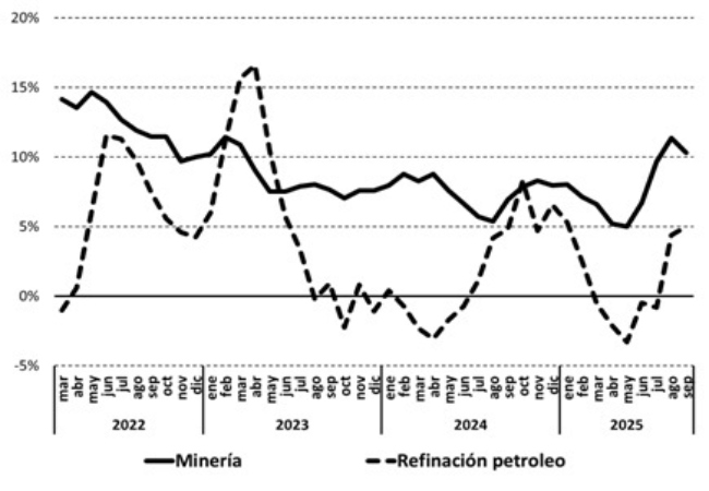 A la refinación de petróleo también le va bien. Pero es más cíclica. Porque al tener un componente industrializador depende más de la coyuntura local. Se observa la caída a finales del 2023 y principios de 2024 y a mediados de 2025. Sin embargo, sacando estos eventos, el crecimiento de este sector es a tasas positivas y altas con lo cual su crecimiento es sostenido. La lección aquí es que, cuando uno le mete valor agregado a una actividad extractiva (refinación de petróleo versus extracción minera pura), empiezan a ser muy relevantes las condiciones de la política económica local.