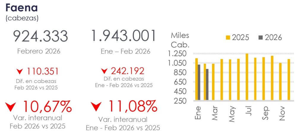 La dinámica reciente del sector ganadero argentino comienza a exhibir indicios que podrían interpretarse como el inicio de un cambio de fase dentro del ciclo ganadero. Los últimos datos disponibles correspondientes al mes de febrero muestran una faena bovina total de 924.333 cabezas, lo que implica una contracción interanual del orden del 10,7%. De esta manera, el acumulado del primer bimestre del año evidencia una caída de aproximadamente 11,1% en comparación con igual período del año previo.