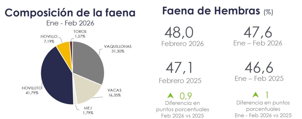 No obstante, se advierte que todavía resulta prematuro afirmar que el proceso de retención de vientres se encuentra plenamente consolidado. Uno de los indicadores más sensibles para evaluar este fenómeno es la participación de hembras —especialmente vaquillonas— dentro del total de animales enviados a faena. Hasta el momento, los registros disponibles no muestran una reducción significativa en este indicador, lo que sugiere que el ajuste observado en la faena podría responder a otros factores coyunturales.