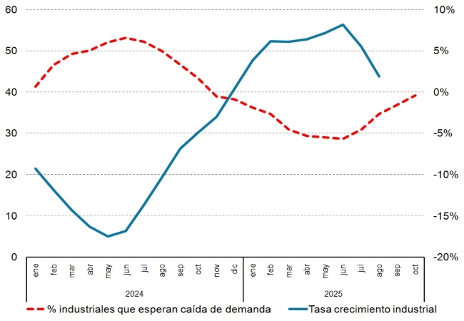 Se puede observar que en la primera mitad del 2024 aumentó el porcentaje de industriales que esperaban caída de su demanda y la tasa de variación del Índice de Producción Industrial mostró efectivamente una fuerte caída que pasó el -15% en mayo 2024. En la segunda mitad del 2024 las expectativas empezaron a ser más favorables y la tasa de crecimiento industrial comenzó primero a ser menos negativa y en el 2025 comenzó a ser positiva.