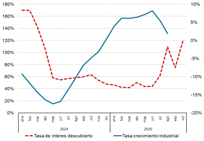 En la primera mitad del 2024 la tasa de interés por descubierto bajó de manera sustantiva. Esto es lo que ayudó a que en la segunda mitad del 2024 y la primera del 2025 la actividad industrial se recuperara. Pero con las desavenencias que se produjeron en la política monetaria y bancaria en la segunda mitad del 2025, la tasa de interés del capital de trabajo volvió a crecer, hasta niveles de 3 dígitos efectivo anual. Este es un factor muy relevante en el desinflamiento de la demanda de las empresas. Sin crédito de corto, es difícil mantener la demanda de insumos para producir.