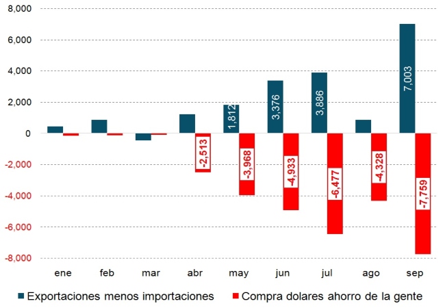 Gráfico 3. Balanza comercial y compra de dólares ahorro de la gente